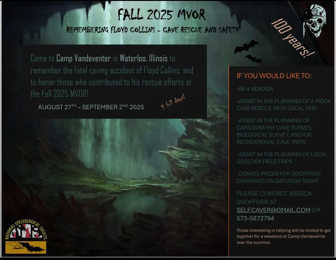 Camp Vandeventer 3463 Trout Camp Rd, Waterloo, IL, United StatesCome to Camp Vandeventer in Waterloo, Illinois to remember the fatal caving accident of Floyd Collins and to honor those who contributed to his rescue efforts at the Fall 2025 MVOR!